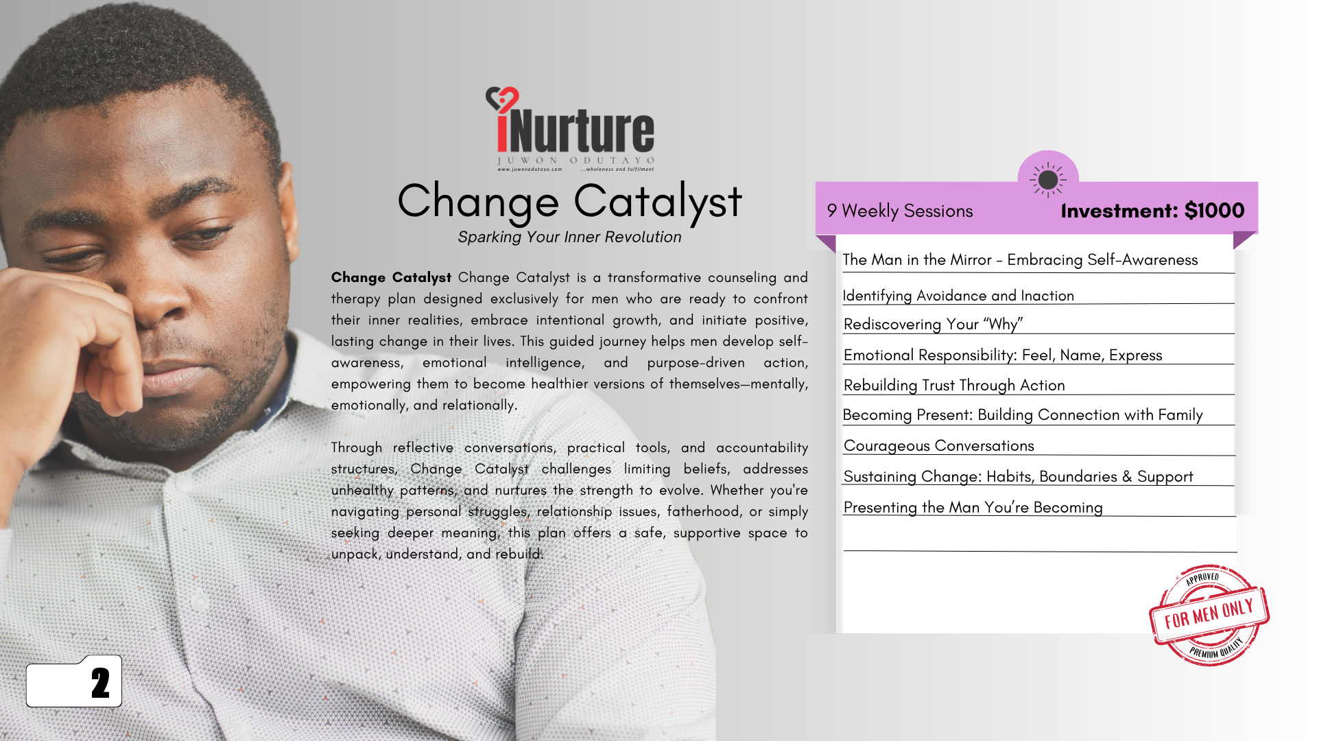 Change Catalyst is a transformative counseling and therapy plan designed exclusively for men who are ready to confront their inner realities, embrace intentional growth, and initiate positive, lasting change in their lives. This guided journey helps men develop self-awareness, emotional intelligence, and purpose-driven action, empowering them to become healthier versions of themselves, mentally, emotionally, and relationally.