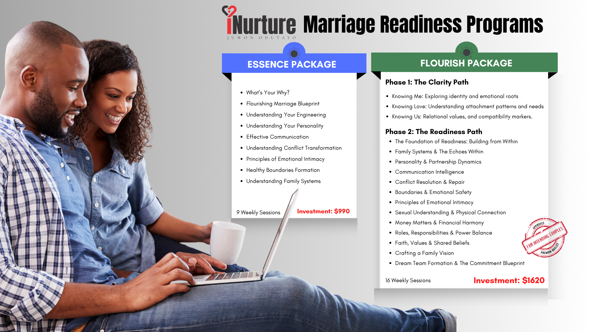 The Marriage Readiness Program is a structured counseling initiative designed for engaged and intending couples who want to build a strong foundation for a fulfilling marriage. This program equips couples with essential relationship skills, including effective communication, conflict resolution, financial management, and emotional intimacy. Through interactive sessions, expert guidance, and practical exercises, participants gain valuable insights to navigate the challenges of married life with confidence and commitment. Whether you’re newly engaged or preparing for marriage, this program helps you lay the groundwork for a thriving lifelong partnership.